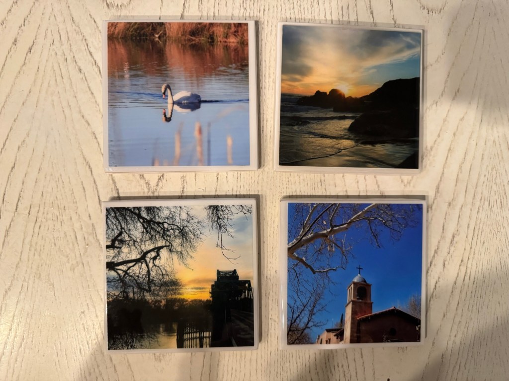 A swan at a nearby lake, the sunset at San Simeon, an old church in Sedona, and sunset at the Freeport Bridge near Sacramento. (sorry about the shadows, I’m learning there is nowhere in my house that is reflection free)